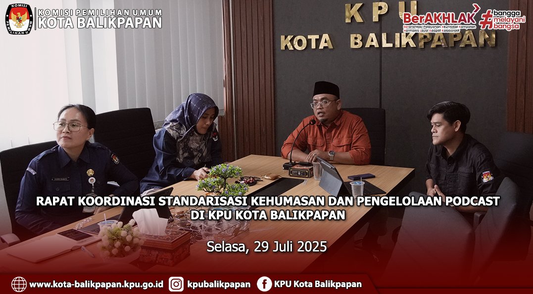 Kota Balikpapan - KPU Kota Balikpapan melaksanakan Rapat Koordinasi Standarisasi Kehumasan dan Pengelolaan Podcast di KPU Kota Balikpapan secara daring pada hari Selasa, 29 Juli 2025.