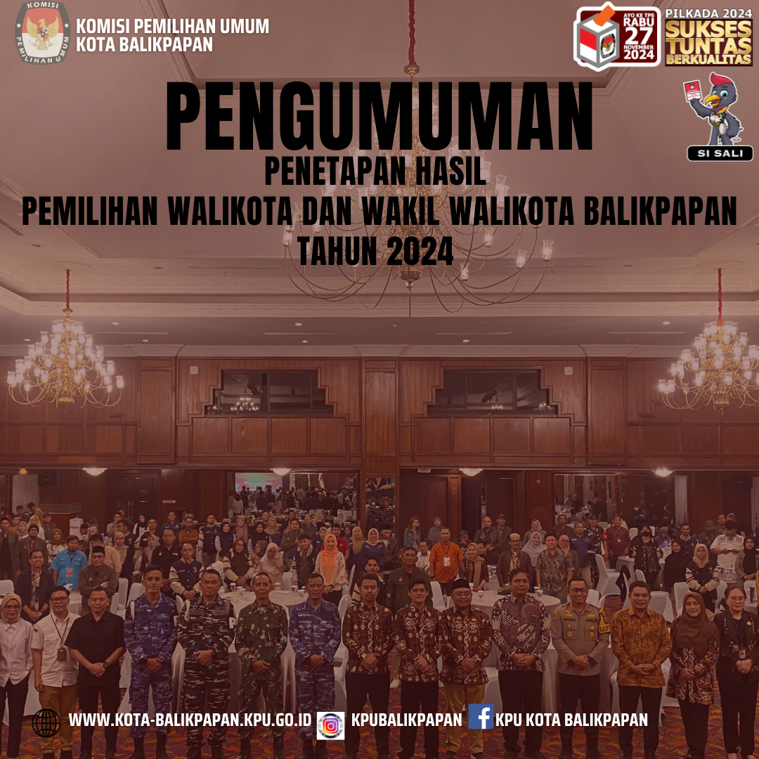 BALIKPAPAN _ Setelah menyelesaikan proses Rapat Pleno Terbuka Rekapitulasi Penghitungan Perolehan Suara yang berlangsung di Hotel Gran Senyiur Balikpapan pada tanggal 4 - 6 Desember 2024, maka Komisi Pemilihan Umum Kota Balikpapan mengumumkan Penetapan Hasil Pemilihan Walikota dan Wakil Walikota Balikpapan Tahun 2024. Adapun hasil penetapan dapat diunggah di sini. 1.  Keputusan Nomor 441 Tahun 2024 tentang Penetapan Hasil Pemilihan Walikota dan Wakil Walikota Balikpapan Tahun 2024 2. D. Hasil Kab/Ko-KWK-Bupati/Walikota Dalam rapat pleno tersebut, KPU Kota Balikpapan juga menetapkan hasil perolehan suara Pemilihan Gubernur dan Wakil Gubernur Kalimantan Timur untuk Tingkat Kota Balikpapan, dengan hasil sebagai berikut :  D.Hasil Kab/Ko-KWK-Gubernur