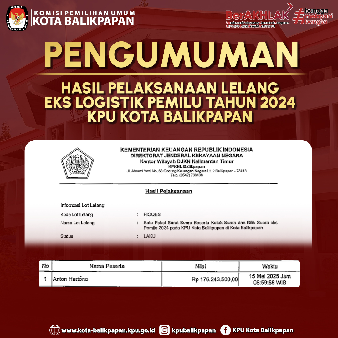 Hasil Pelaksanaan Lelang Eks Logistik Pemilu Tahun 2024 KPU Kota Balikpapan
