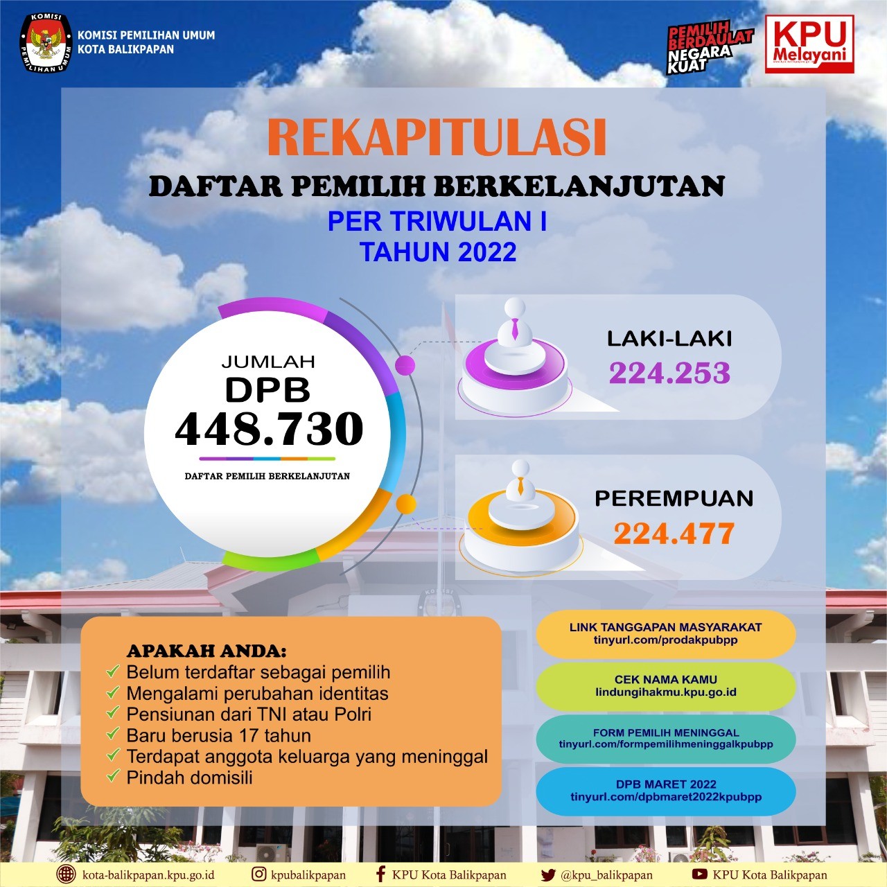 Berdasarkan Berita Acara Nomor: 19/TIK.04/6471/202, rekapitulasi Daftar Pemilih Berkelanjutan Triwulan I Tahun 2022 berjumlah sebanyak 448.730 ( empat ratus empat puluh delapan ribu tujuh ratus tiga puluh. Dalam rapat yang dihadiri oleh instansi – instansi terkait ini selain menyampaikan Rekap Data Pemilih Berkelanjutan, KPU Kota Balikpapan melalui Ketua, Noor Thoha, juga memberikan informasi-informasi mengenai persiapan pelaksanaan Pemilu Serentak 2024. (RR)