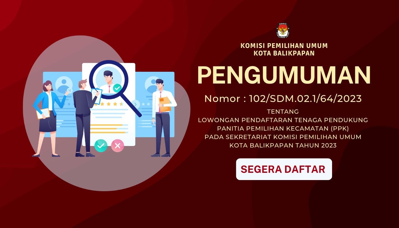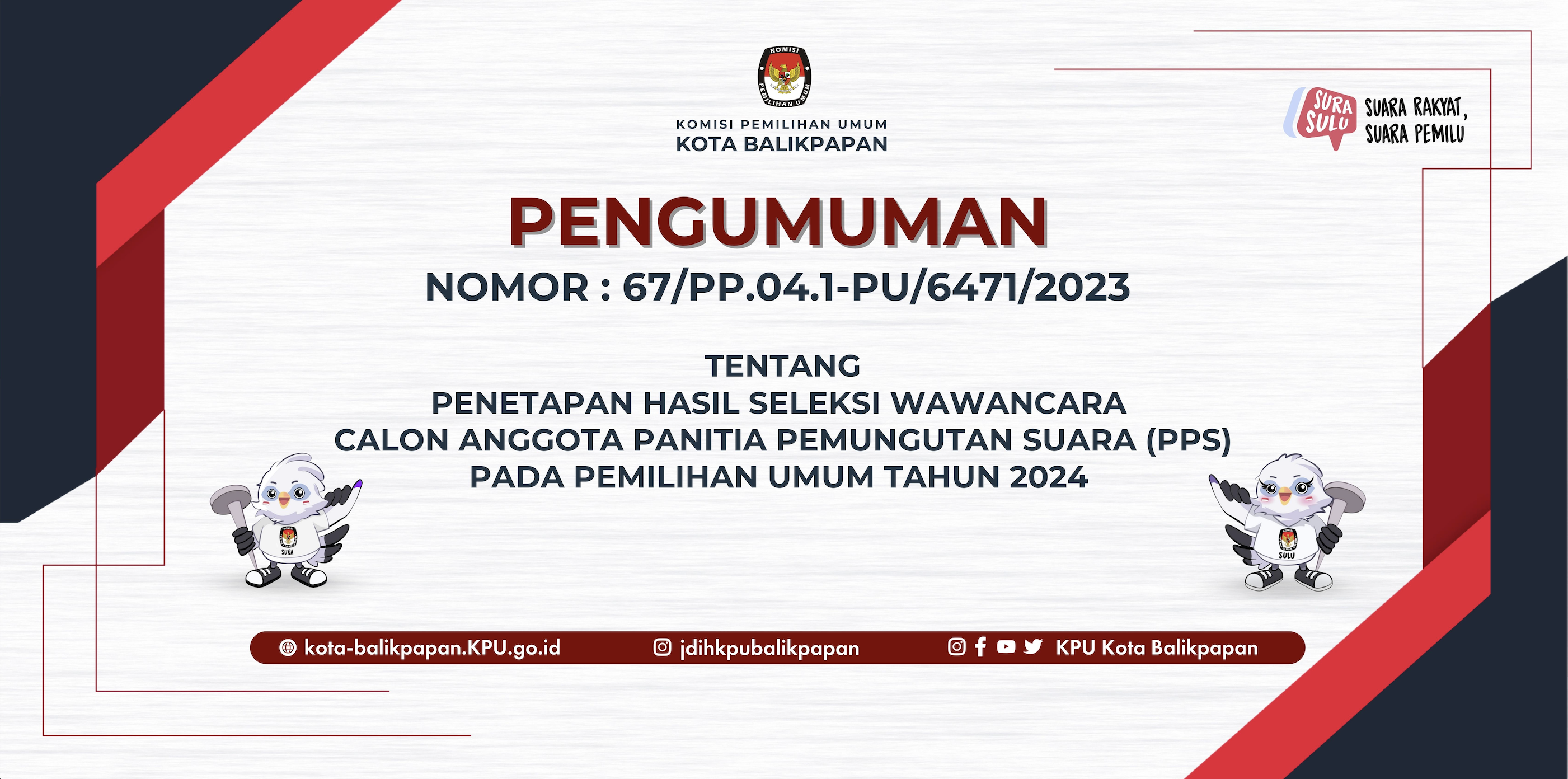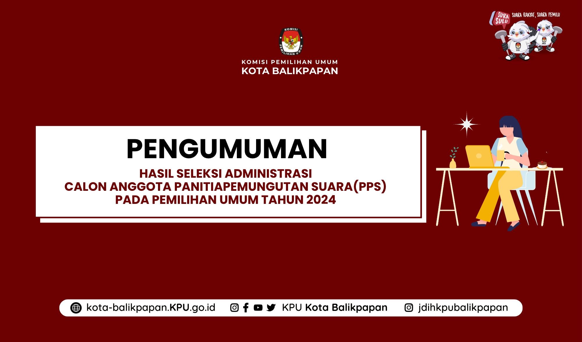 Berdasarkan Berita Acara Rapat Pleno KPU Kota Balikpapan Nomor 16/PP.04.1- BA/6471/2023 tanggal 15 Januari 2023 Tentang Hasil Seleksi Tertulis Calon Anggota Panitia Pemungutan Suara(PPS) Pada Pemilihan Umum Tahun 2024, disampaikan hal-hal sebagai berikut: