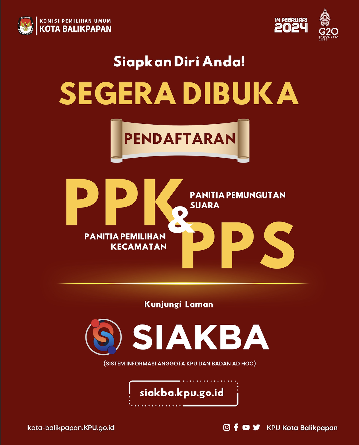 BALIKPAPAN - KPU Kota Balikpapan akan segera membuka Pendaftaran PPK (Panitia Pemilihan Kecamatan) dan PPS (Panitia Pemungutan Suara) untuk Pemilu 2024. Berbeda dengan pemilu sebelumnya, kali ini pendaftaran akan menggunakan sistem online dengan aplikasi Sistem Informasi Anggota KPU dan Badan Ad Hoc (SIAKBA). SIAKBA merupakan seperangkat sistem teknologi informasi yang berbasis web dalam rangka memfasilitasi tahapan seleksi anggota KPU Provinsi, Kabupaten / Kota dan badan adhoc (PPK, PPS, PPLN) yang secara resmi telah diluncurkan oleh KPU RI dalam rangkaian kegiatan Rapat Koordinasi Pembentukan Badan Adhoc Penyelenggara Pemilu Tahun 2024, di Hotel Claro, Kendari, Sulawesi Tenggara, pada tanggal 20 Oktober 2022 yang lalu.