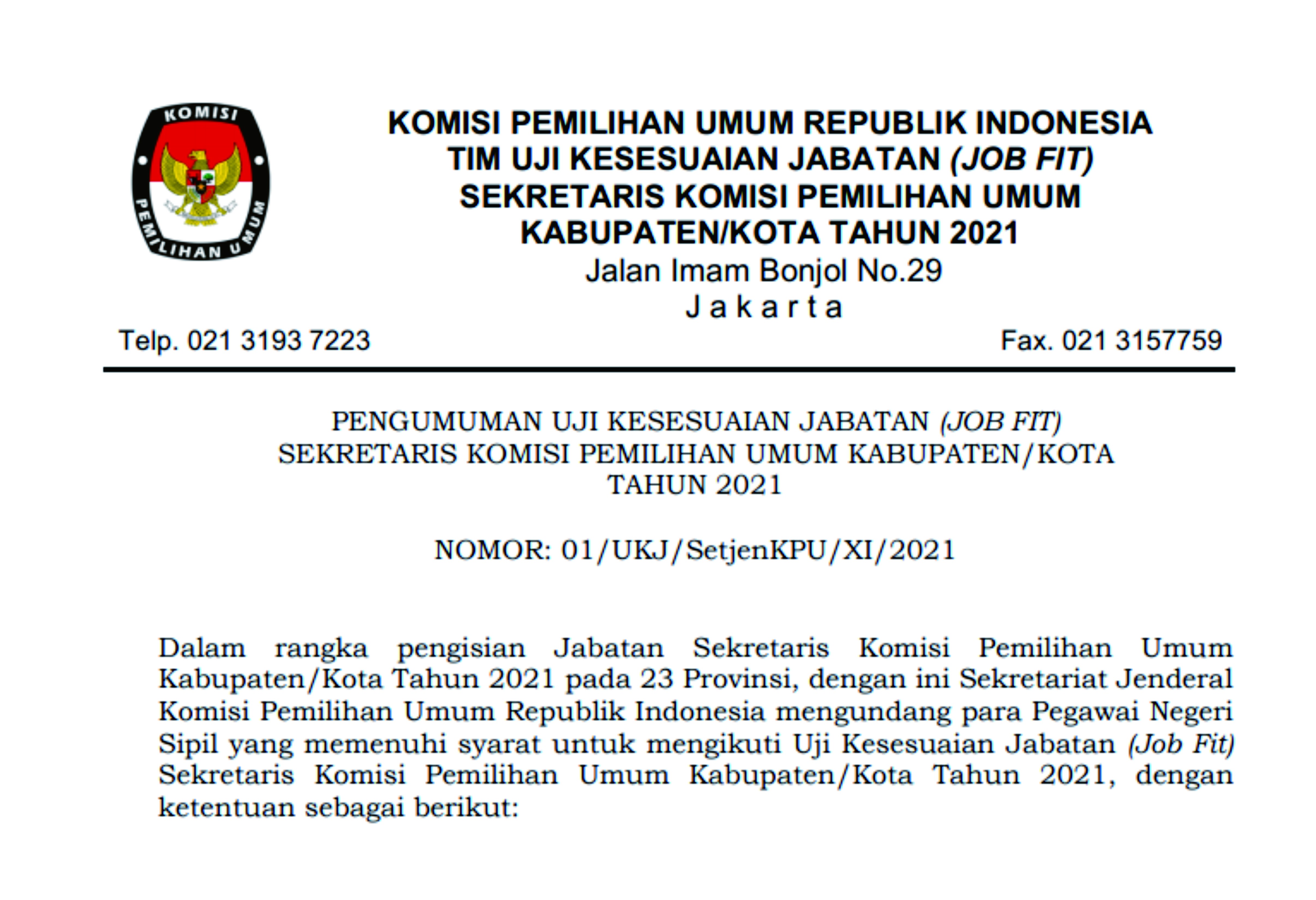 Pada tanggal 30 November 2021, Sekretaris Jenderal KPU RI menerbitkan pengumuman nomor: 01/UKJ/SetjenKPU/XI/2021 mengenai uji kesesuaian jabatan (job fit) Sekretaris Komisi Pemilihan Umum Kabupaten/Kota tahun 2021 Dalam rangka pengisian Jabatan Sekretaris Komisi Pemilihan Umum Kabupaten/Kota Tahun 2021 pada 23 Provinsi, dengan ini Sekretariat Jenderal Komisi Pemilihan Umum Republik Indonesia mengundang para Pegawai Negeri Sipil yang memenuhi syarat untuk mengikuti Uji Kesesuaian Jabatan (Job Fit) Sekretaris Komisi Pemilihan Umum Kabupaten/Kota Tahun 2021,