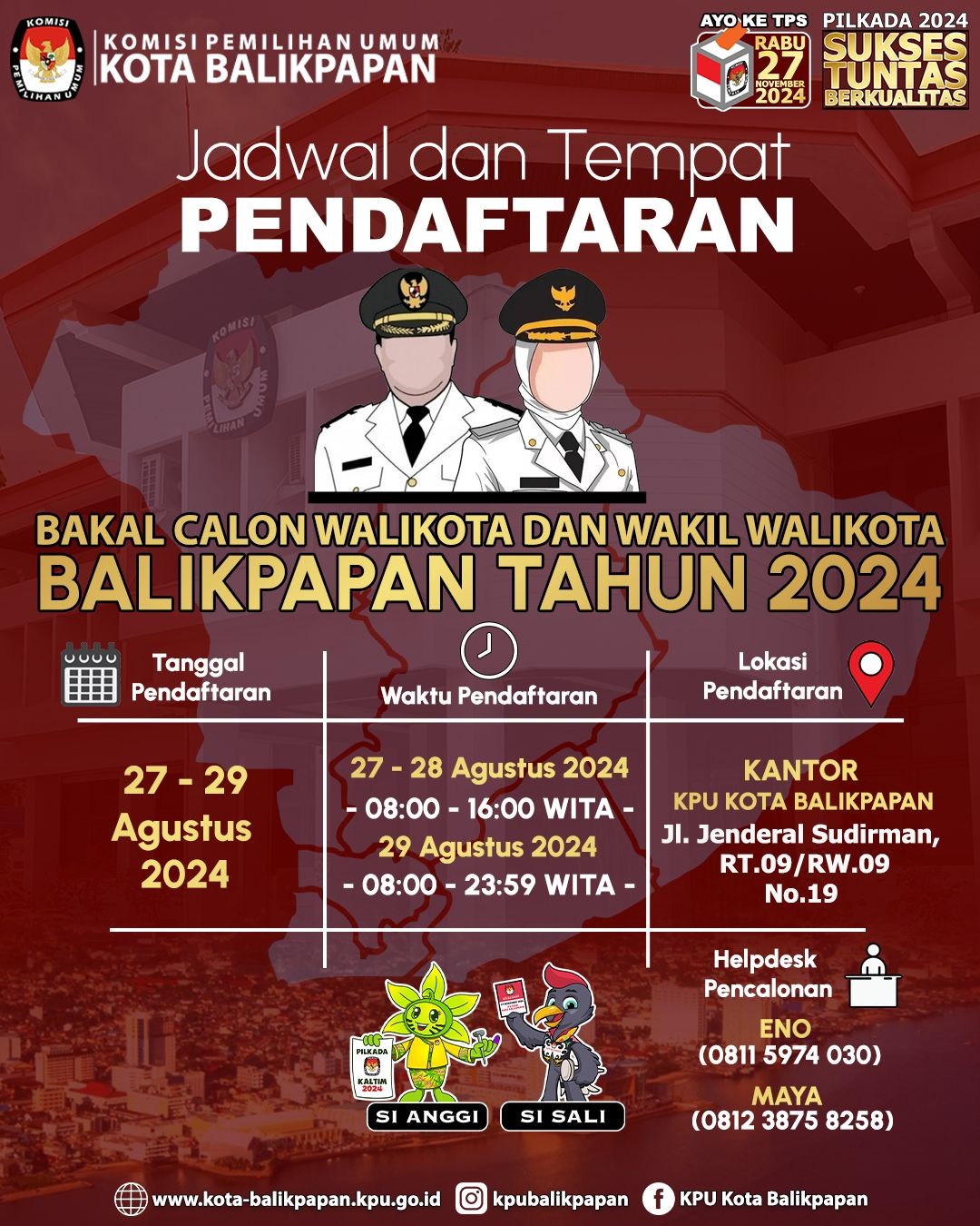 Waktu Pendaftaran Pasangan Calon Walikota dan Wakil Walikota Balikpapan Tahun 2024 mulai Selasa, 27 Agustus 2024 s.d Rabu, 28 Agustus 2024 Pukul 08.00 s.d Pukul 16.00 WITA dan Kamis, 29 Agustus 2024 Pukul 08.00 s.d Pukul 23.59 di Kantor Komisi Pemilihan Umum Kota Balikpapan, Jl. Jenderal Sudirman Nomor 19 RT. 09 Kelurahan Prapatan, Kecamatan Balikpapan Kota, Balikpapan.