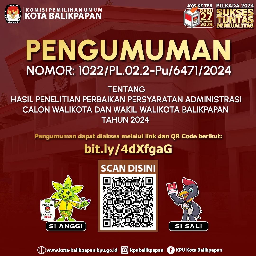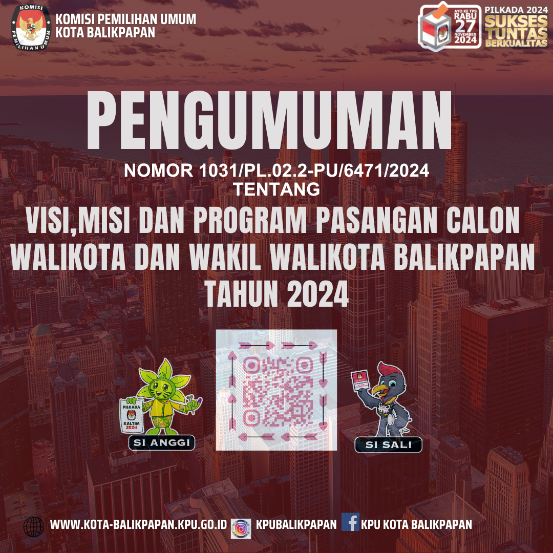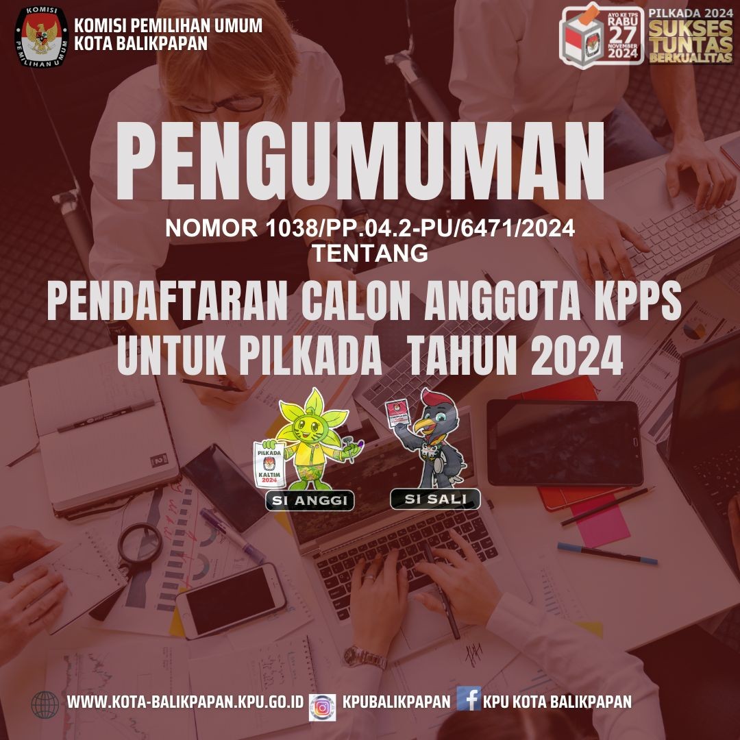 BALIKPAPAN_Dalam rangka melaksanakan ketentuan Pasal 95 ayat (1) Peraturan Komisi Pemilihan Umum Nomor 8 Tahun 2024 tentang Pencalonan Gubernur dan Wakil Gubernur, Bupati dan Wakil Bupati, serta Walikota dan Wakil Walikota, Komisi Pemilihan Umum Kota Balikpapan mengumumkan Pendaftaran Calon Walikota dan Wakil Walikota Balikpapan Tahun 2024 mulai hari ini, Sabtu, 24 Agustus 2024.