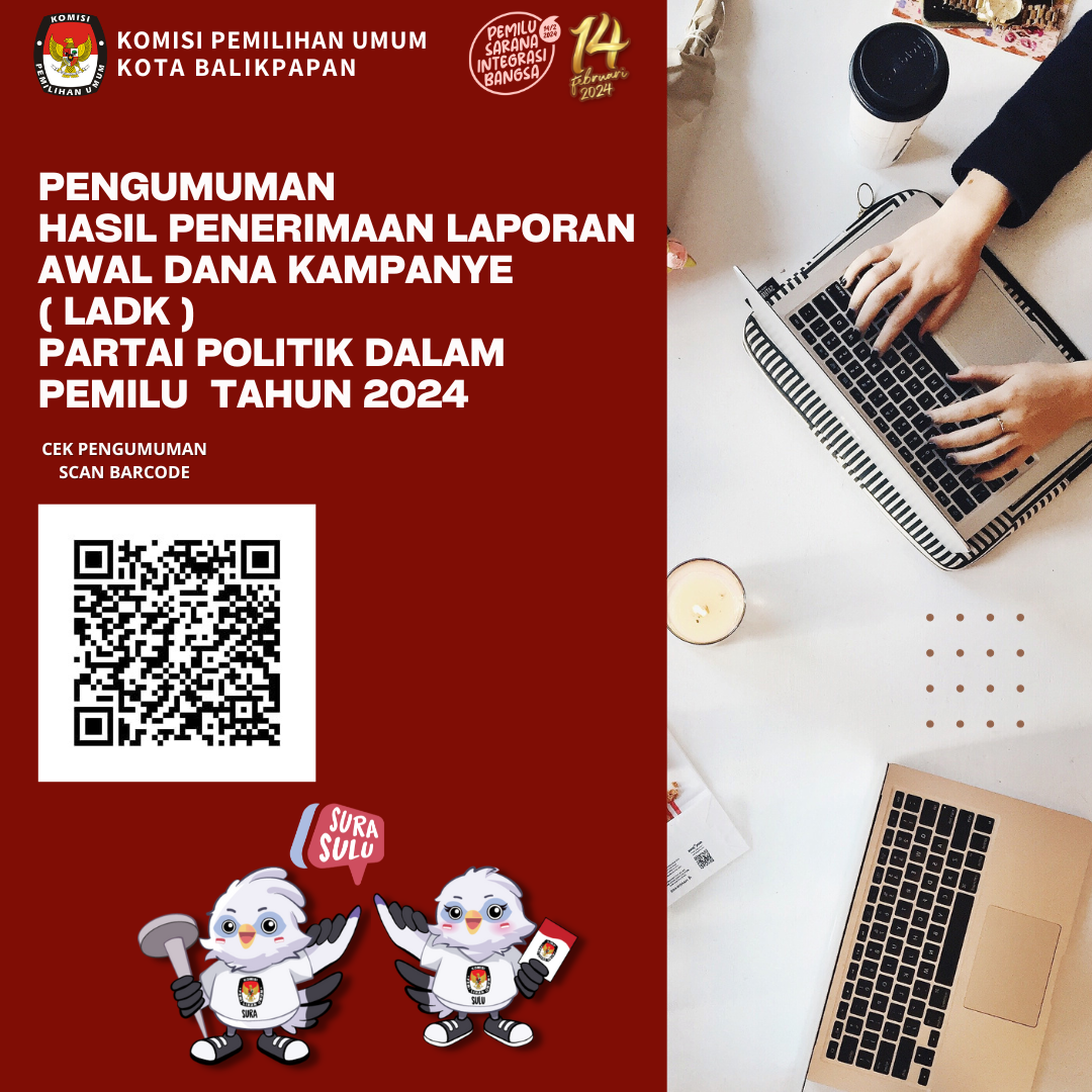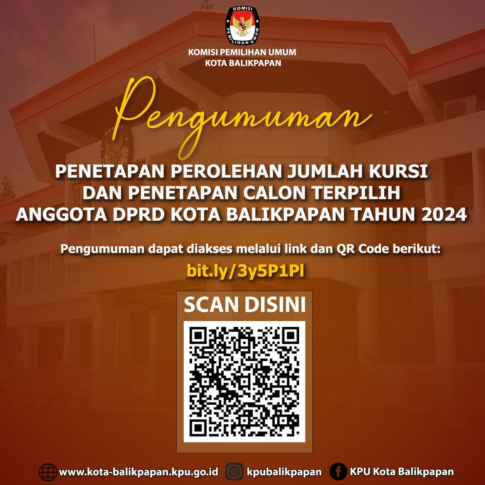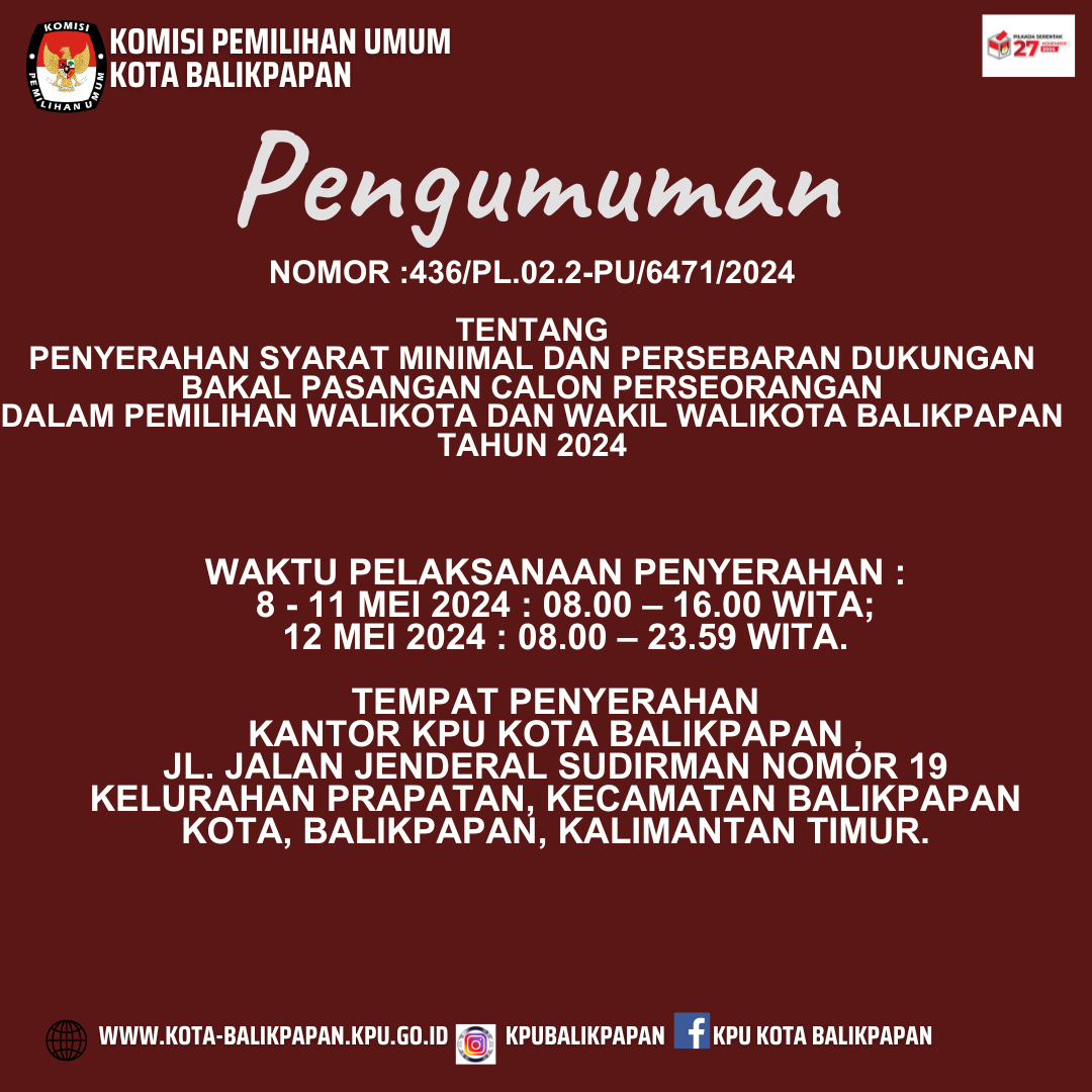 Berdasarkan Pasal 41 ayat (1) UU No 10 Tahun 2016, Calon Perseorangan dapat mendaftarkan diri sebagai Calon Walikota dan Wakil Walikota jika memenuhi Syarat Dukungan Jumlah Penduduk yang mempunyai hak pilih dan termuat dalam Daftar Pemilih Tetap pada Pemilihan Umum atau Pemilihan sebelumnya yang paling akhir di daerah bersangkutan serta Keputusan Komisi Pemilihan Umum Kota Balikpapan Nomor 37 Tahun 2024 Tentang Syarat Minimal Dan Persebaran Dukungan Bakal Pasangan Calon Perseorangan Dalam Pemilihan Walikota dan Wakil Walikota Balikpapan Tahun 2024, bersama ini di sampaikan Pengumuman,download